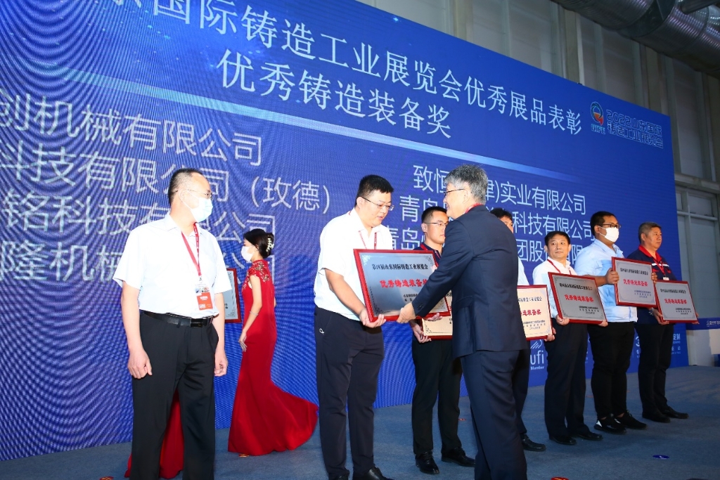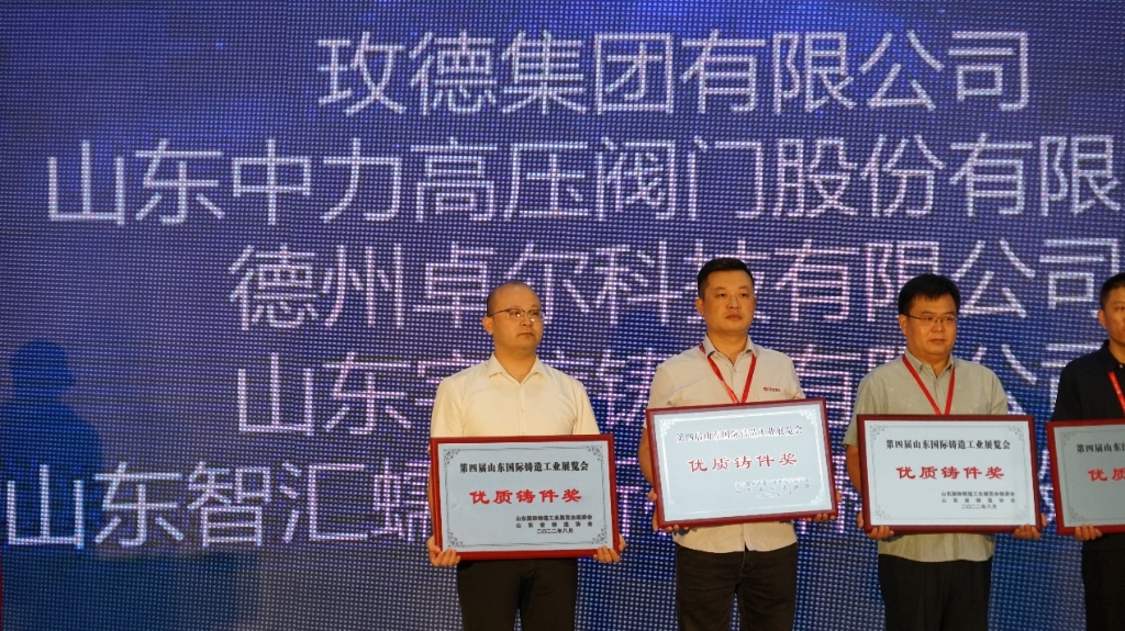 玫德集团参评“250规格爬架导座”展品,经专家评审组评定荣获“优秀铸件奖”,科德智能副总经理张明一代表集团上台领奖。