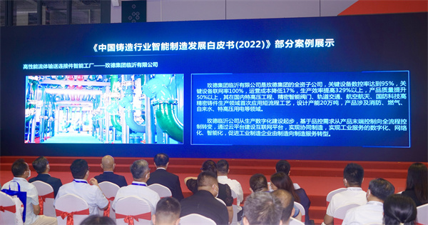同期举行了《中国铸造行业智能制造发展白皮书(2022)》发布会,科德案例入选白皮书:科德智能为玫德集团临沂有限公司规划设计的智能工厂经典案例——《高性能流体输送连接件智能工厂》。