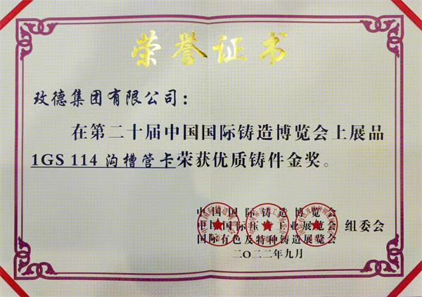 1.玫德集团有限公司的1GS 114沟槽管卡荣获“优质铸件金奖”。