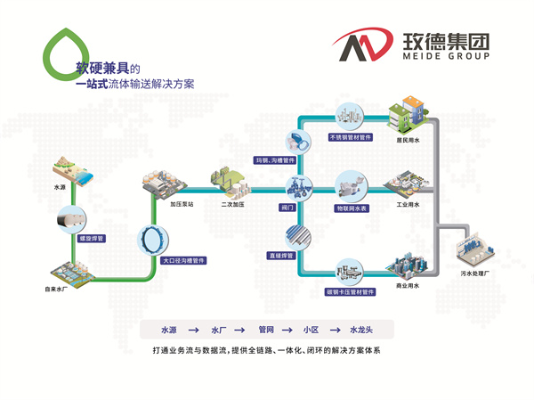 玫德集团水务领域产品涵盖管道、管卡、智能阀门、玛钢沟槽、不锈钢管材管件、碳钢卡压管件、物联网表、泵房预制BIM设计及智慧水务,全自主研发,软硬兼具的一站式解决方案。
