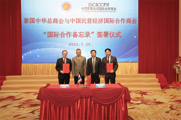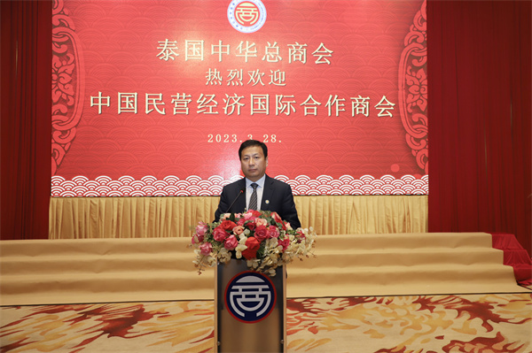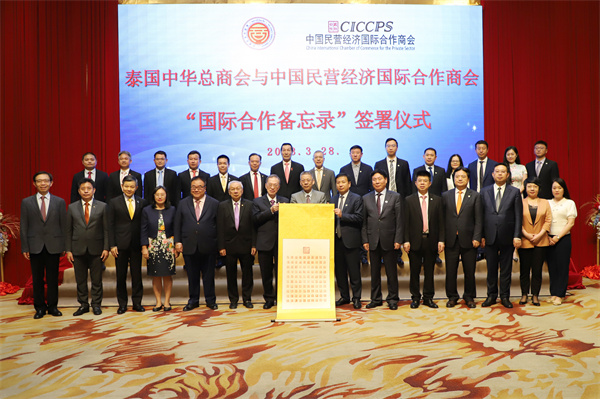 3月28日下午,考察团一行拜访了泰国中华总商会,中国驻泰大使馆商务公参王立平、泰国中华总商会副主席何克家、泰国中华总商会副秘书长萧汉铭、欧先梓先生以及商会其他领导一起出席交流活动,孔主席代表考察团发表致辞,并参与了泰国中华总商会与中国民营经济国际合作商会“国际合作备忘录”签署仪式,双方互赠礼物并合影留念。