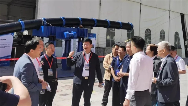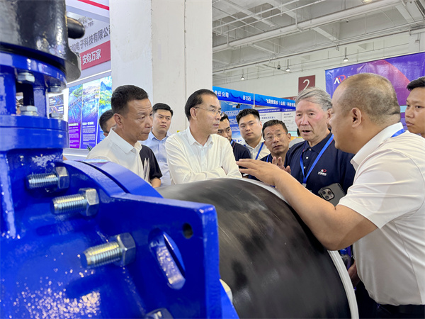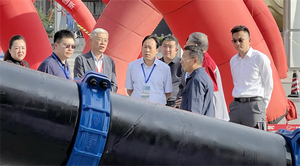 甘肃省水利厅厅长牛军,甘肃省水利厅一级巡视员、省水利学会理事长吴天临,甘肃省水利水电勘测设计研究院有限责任公司水利工程正高级工程师张东等莅临玫德集团展位参观指导。参观到大口径钢管柔性连接技术时,牛军厅长讲此技术解决了管道的很大难题,具有非常广阔的应用前景。
