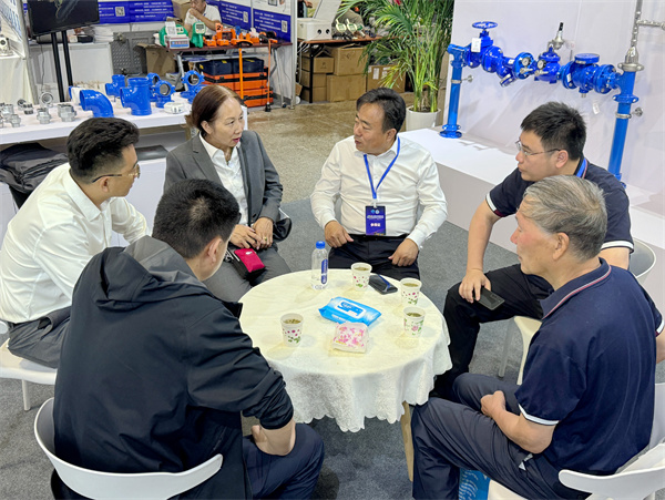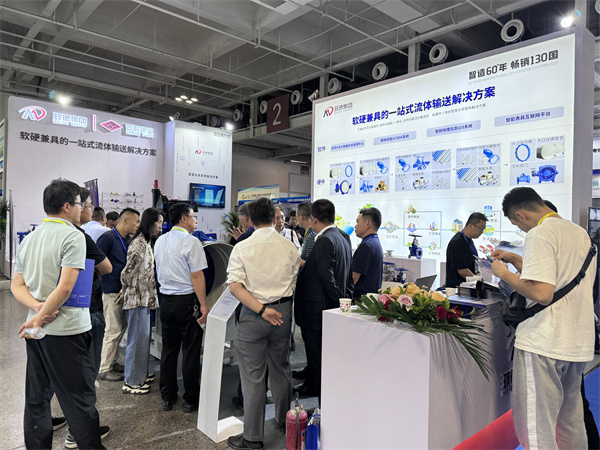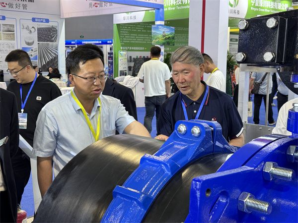 许多参展者慕名前来咨询大口径钢管柔性连接技术,玫德展位人流络绎不绝。
