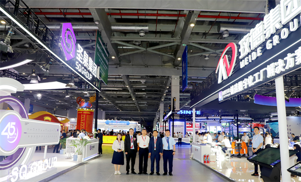 济南圣泉集团股份有限公司总裁唐地源、烟台胜地汽车零部件制造有限公司总裁张宝芝莅临玫德展位参观考察,玫德集团董事局主席孔令磊与其共同探讨玫德集团智能制造以及数字化工厂解决方案。