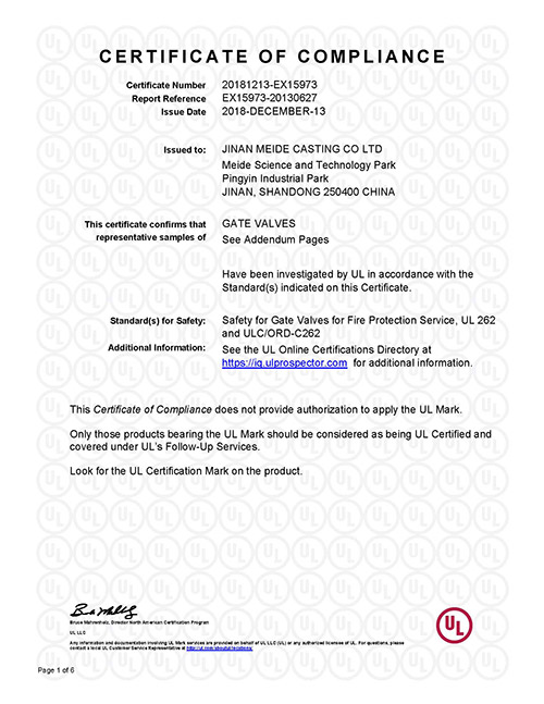 Jinan Meide Casting Co., Ltd. has got UL approval for Flanged Resilient NRS Gate Valve with Post Flange (Z45XC-2 DN350-600)