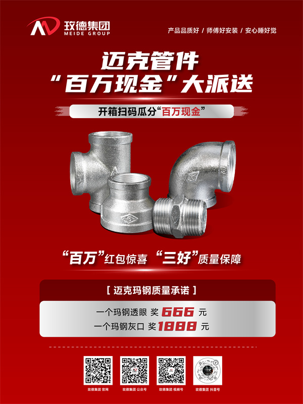 即日起,凡购买玫德集团迈克牌玛钢、沟槽管件,有机会参与开箱扫码瓜分 “百万现金” 活动!